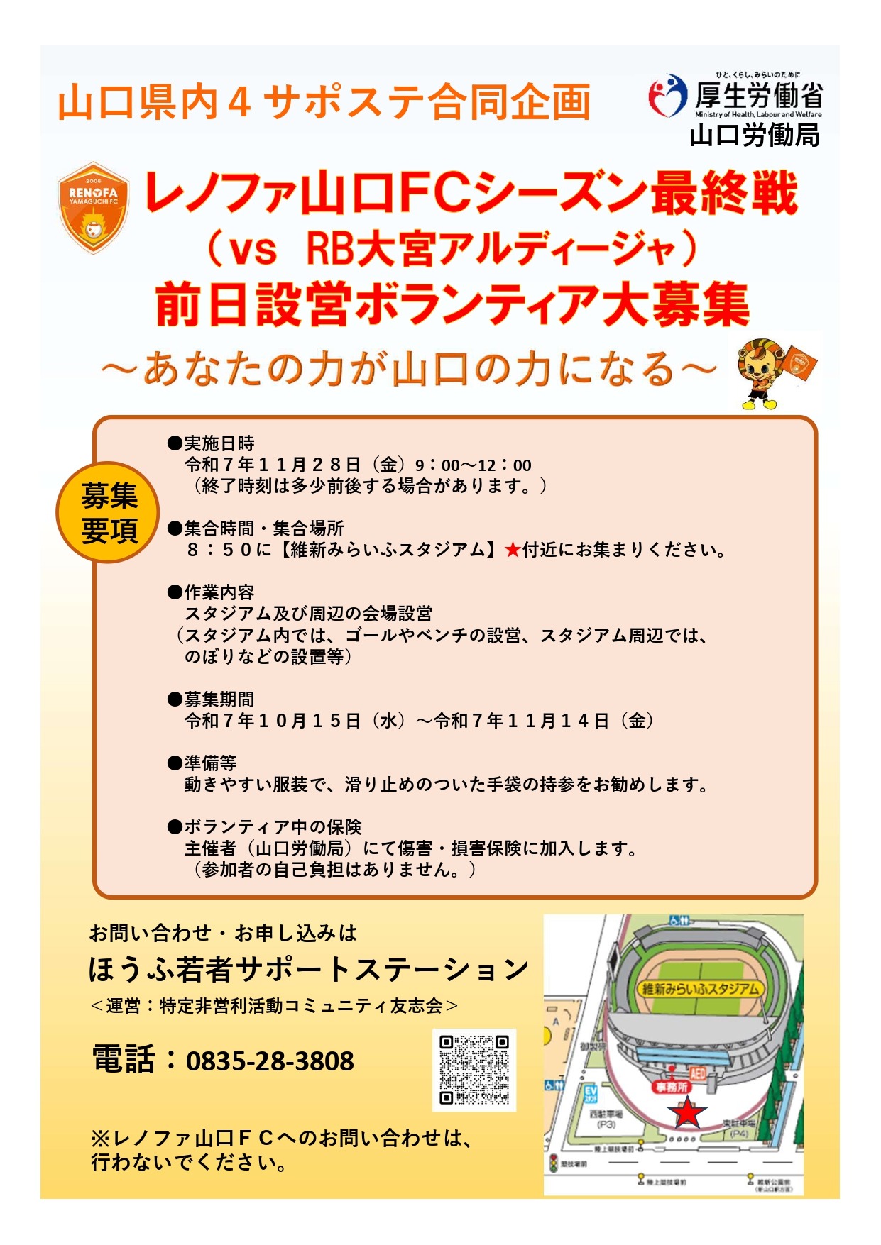レノファ山口ホーム最終戦 前日設営ボランティア大募集のお知らせ